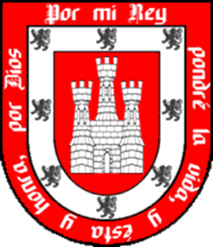 En campo de gules un castillo de plata, bordura de plata con ocho leones rampantes en sable; otra segunda bordura de gules con este lema en letras de plata: "Por mi rey pondré la vida, y esta y honra por mi Dios".